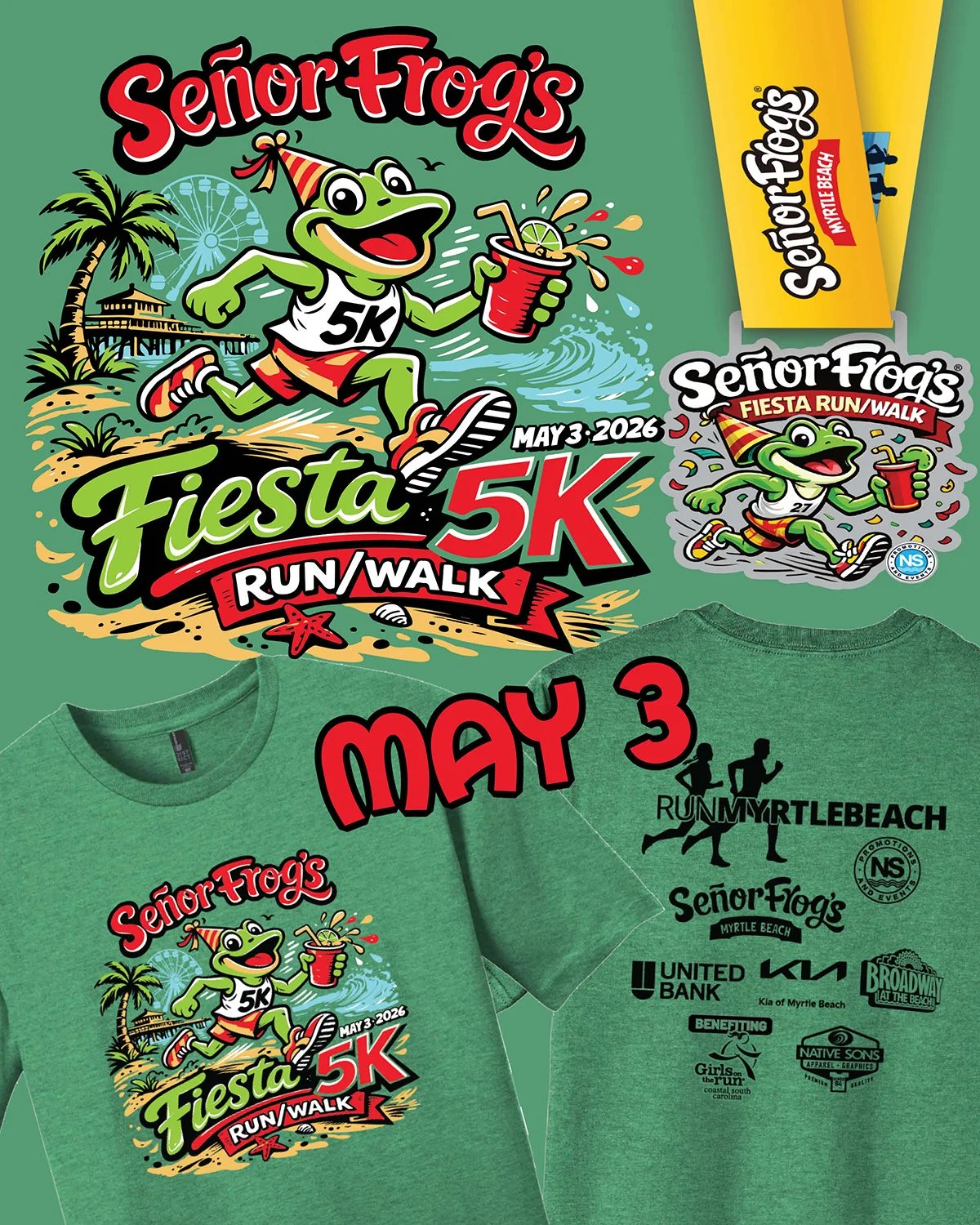 Join NS PROMOS for the SEÑOR FROGS FIESTA Run/Walk at Señor Frogs at Broadway at the Beach in Myrtle Beach, SC! We are excited to partner with Señor Frogs for this race and look forward to seeing you there! Runners and Walkers are all welcome!! All 5K race participants receive a complimentary light buffet breakfast! Additional breakfast buffets can be purchased during registration for $12.00. Dress up in your most festive attire for a chance to win the costume contest!