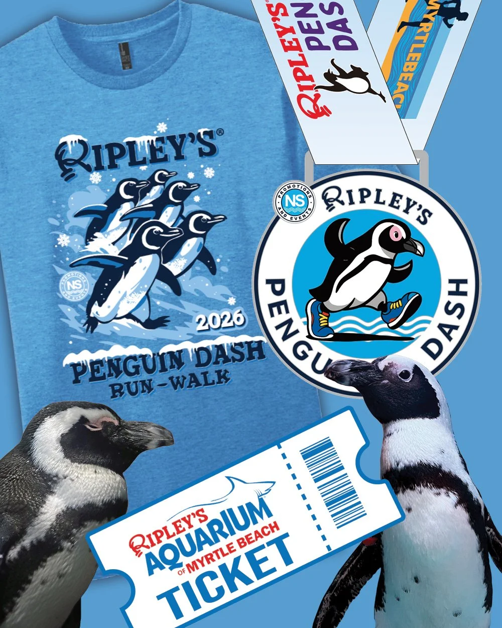 Ripley’s Aquarium of Myrtle Beach is excited to host the Penguin Dash and Ripley’s Penguin Family Fun 1 mile walk/run. This family-friendly, themed event will be a celebration of the South African Penguins. There is even a free Toddler Waddle taking place in front of Ripley’s Aquarium that morning at 9am. This event will start and end in front of Ripley’s Aquarium at Broadway at the Beach and the route takes the runners through the Broadway at the Beach shopping and dining complex. Norman and Sharkee will be there and we may get a special visit from the penguins themselves!